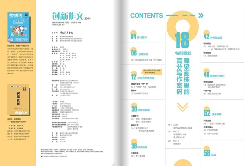 《創新作文》雜志是一本專注于激發青少年創造力和想象力的文學刊物。該雜志致力于為青少年提供一個展示自己寫作才華的舞臺,鼓勵他們勇敢表達內心世界、分享獨特見解的機會。該雜志每期都會推出一些優秀的青少年作家的作品,這些作品涵蓋了各種文學體裁,如散文、小說、詩歌等。通過展示這些優秀作品,雜志旨在激勵更多的青少年投入到寫作中,培養他們的文學修養和表達能力。