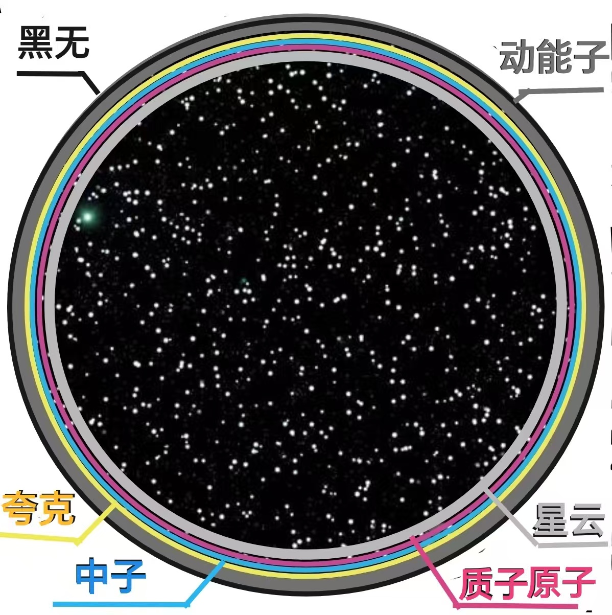 停止這個燒腦話題,回到前面講述的宇宙最外層,均衡排列的動能子層。如果宇宙內部沒有產生原子,星云和星系,整個宇宙就相當于布滿了均勻的動能子,被“黑無”拉拽著。但是事實上不可能沒有變化。宇宙向內的動能子,是由少到多地聚集,逐步演變成夸克、中子、質子、原子、星云、星系。這個形成過程下一章節講解。(見圖三)
