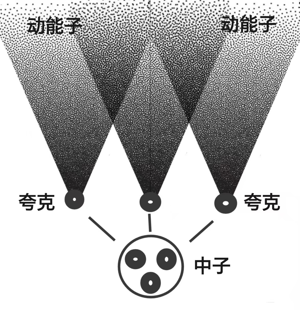 夸克層的下一層是中子層。在夸克層和中子層的過渡區域,夸克之間同樣是橫向間隔被縮短,縱向間隔被拉長。導致自然選擇了以三個夸克為一組,抱團組成一個中子。體現了三足鼎立的穩定性。三個夸克在強核力作用下相互吸引環繞。其中一個夸克被撞出一個反向動能子,成為共用電子。電子圍繞三個夸克旋轉,造成上夸克帶+2/3電荷,另外兩個下夸克各帶-1/3電荷。