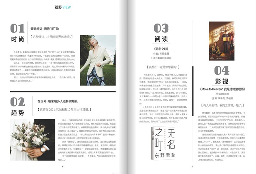 該雜志內容豐富多樣,力求涵蓋女性生活的各個方面,主要包括以下幾個欄目:時尚趨勢:該欄目主要介紹最新的時尚趨勢和流行風潮,包括服裝、美容、發型、彩妝等方面的資訊。讀者可以通過這一欄目了解最新的時尚信息,跟上潮流。美麗生活:該欄目關注女性美容、保養、健康等方面的知識和建議。包括護膚、化妝、減肥、健身等各個方面的內容,幫助女性保持良好的身體和令人贊嘆的外貌。