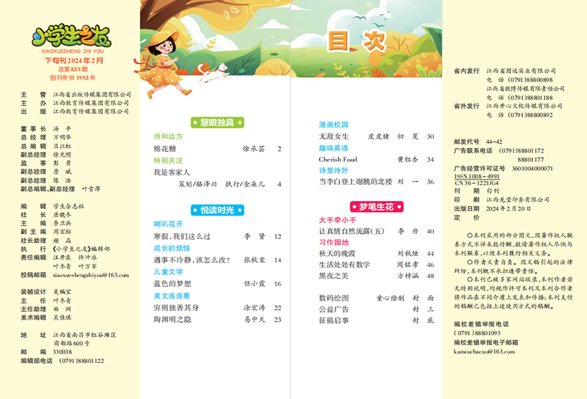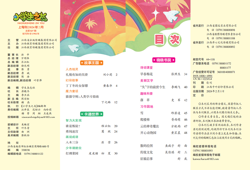 作為小學生的良師益友,該雜志以培養孩子們的閱讀習慣和綜合素質為己任,以活潑有趣的形式,為孩子們打造一個全新的學習天地。無論是故事、科普知識還是趣味游戲,都能讓孩子們在輕松愉快的氛圍中獲取知識,提升自我。除了內容豐富外,還注重引導孩子們樹立正確的價值觀念和人生觀念,促進他們的全面發展。通過雜志中的優秀文章、精彩故事和活動安排,培養孩子們的思維能力、表達能力和創造力,幫助他們建立積極的人生態度。