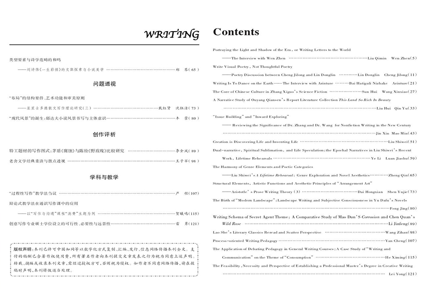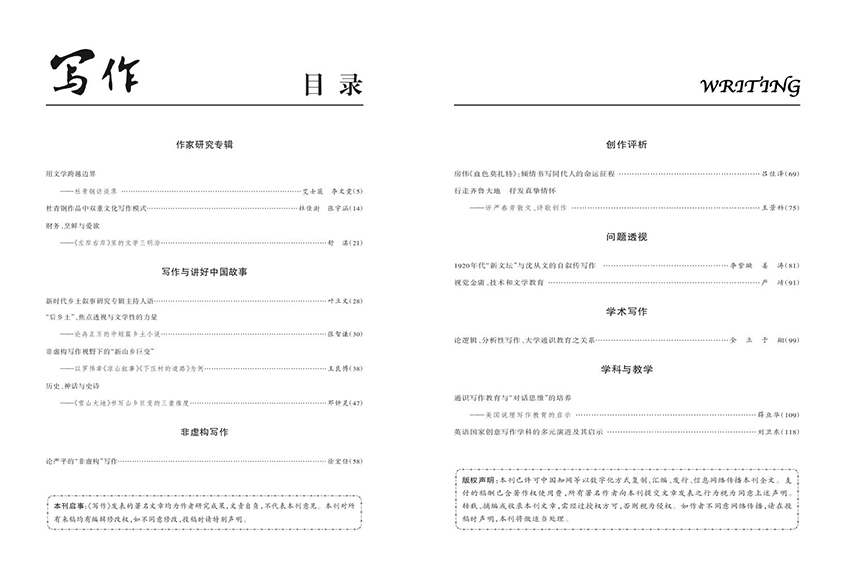 《寫作》是一本專注于提升寫作能力和藝術(shù)的文學(xué)雜志,致力于為廣大寫作愛(ài)好者和專業(yè)作家提供專業(yè)的指導(dǎo)、技巧與啟發(fā)。本雜志每期涵蓋了各類文學(xué)作品的創(chuàng)作與鑒賞、寫作技巧與方法、作家專訪以及寫作市場(chǎng)動(dòng)態(tài)等內(nèi)容,旨在幫助讀者深度了解寫作領(lǐng)域的最新發(fā)展和趨勢(shì)。該雜志的主要特色之一是注重實(shí)用性。每期雜志都會(huì)提供豐富的寫作指導(dǎo),讓讀者可以通過(guò)學(xué)習(xí)專業(yè)的寫作技巧和方法,提升自己的寫作水平。無(wú)論是小說(shuō)、散文、劇本還是詩(shī)歌,雜志都會(huì)涵蓋各種文學(xué)體裁,并通過(guò)實(shí)例和分析給予讀者深入的理解與啟發(fā)。