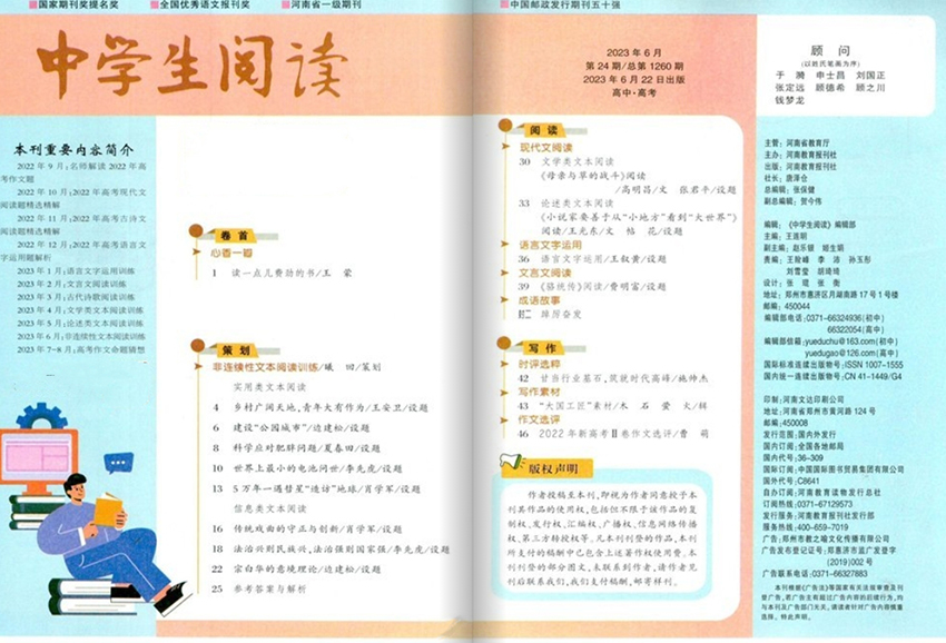 《中學生閱讀》是一本面向中學生讀者的綜合性閱讀雜志。它為中學生提供了一個豐富多彩的閱讀平臺,旨在培養學生的閱讀興趣、拓寬視野、提升文化素養,幫助他們全面發展。該雜志注重內容的多樣性和廣度。每期雜志都包含了豐富的內容,涵蓋了新聞時事、科技科普、歷史人文、文學藝術、健康教育等多個領域。無論是對時事熱點的關注,還是對傳統文化的傳承與發展,雜志都能滿足讀者的需求,讓他們了解到各種不同的知識和觀點。