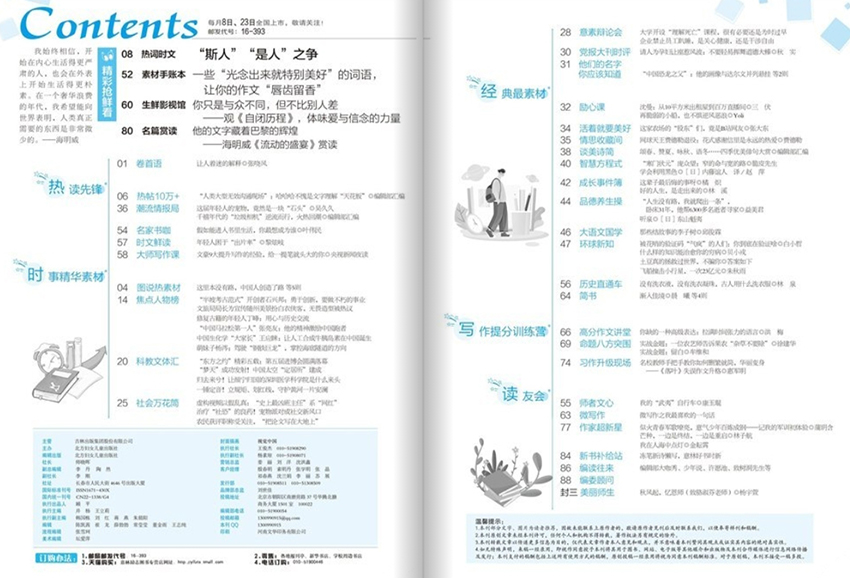 除了作文作品的刊載外,本雜志還定期邀請國內著名作家、教育專家、文學評論家等進行作文點評和專題講解,提供給讀者更多的學習與創作靈感。同時,雜志組織各類作文比賽和活動,為更多中學生提供展示作文才華和交流學習的平臺,助力中學生作文創作的提高和追求卓越。該雜志珍視每一篇優秀作文,堅持以中學生作文為主要內容,為廣大中學生提供了一個展示自己、交流學習、提高寫作水平的平臺,也為廣大讀者帶來了一份鮮活、樸實、真摯的文學美食。我們期待更多中學生和廣大讀者的關注和支持,共同見證中學生作文創作的飛躍與成長!
